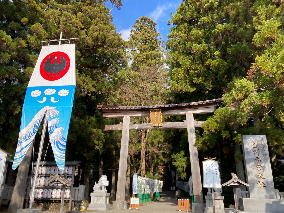 湯の峰温泉から車でわずか約5分、全国3,000社以上の熊野神社の総本宮「熊野本宮大社」へ。かつて熊野古道を歩いてきた参詣者たちが最初に目指した聖地で、八咫烏(やたがらす/日本サッカー協会のシンボル)信仰の中心地でもあります。