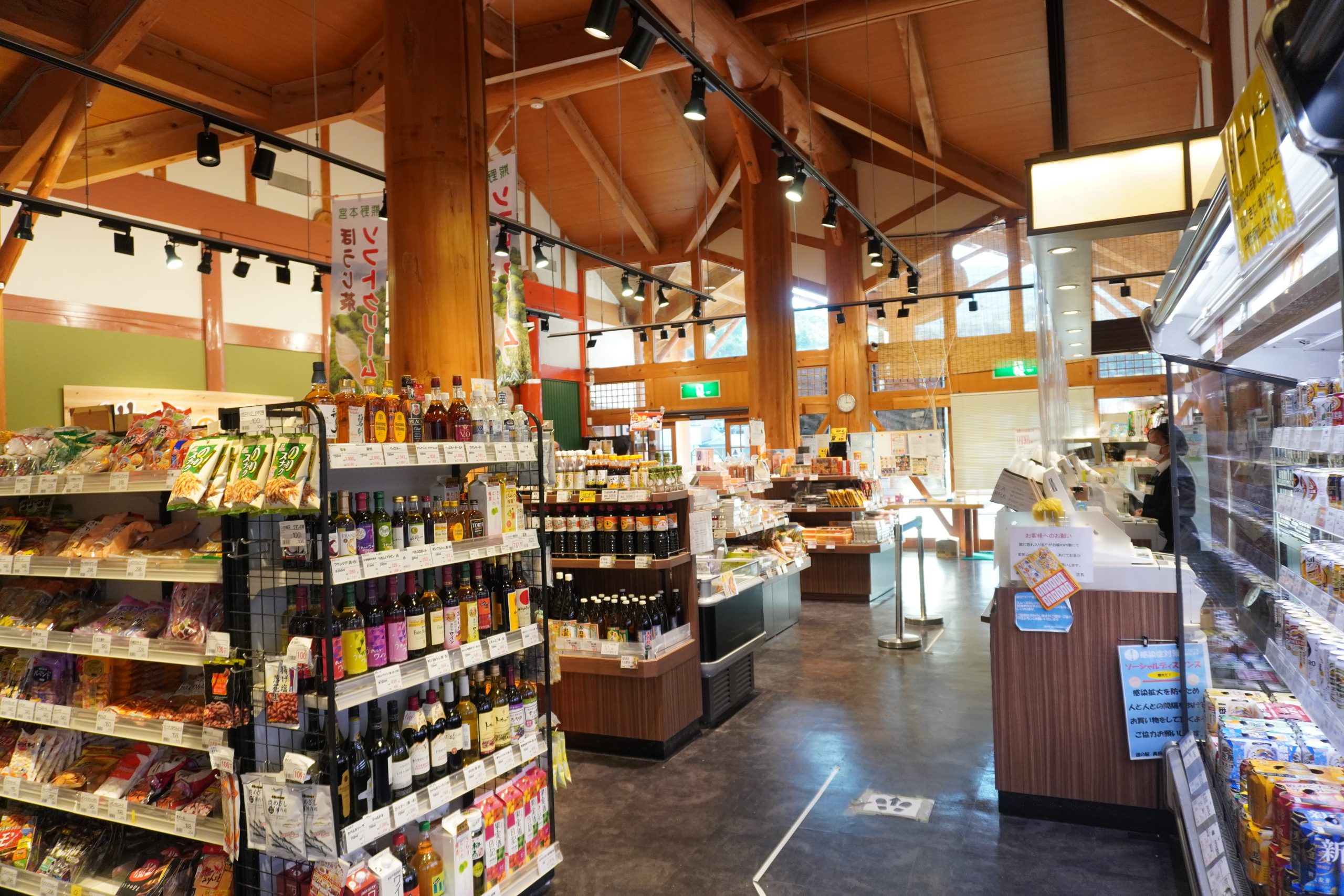 日本三大美人湯のひとつ・龍神温泉(和歌山は本当に温泉地が多いんです)のそばにある道の駅。森林組合が運営し、木工品・家具・食器・アロマグッズなど「木の作品」が所狭しと並ぶ「木の道の駅」です。建物の大黒柱も圧巻の見ごたえがあります。